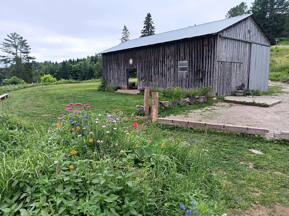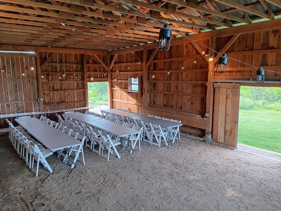The Barn measures 24 x 48 feet with 12-foot-high vertical walls. It has sliding doors on three sides that can be closed if the weather turns really foul. The sound of rain on the tin roof is musical. This particular setup seats 48 with 2 serving tables on side wall using half the barn.